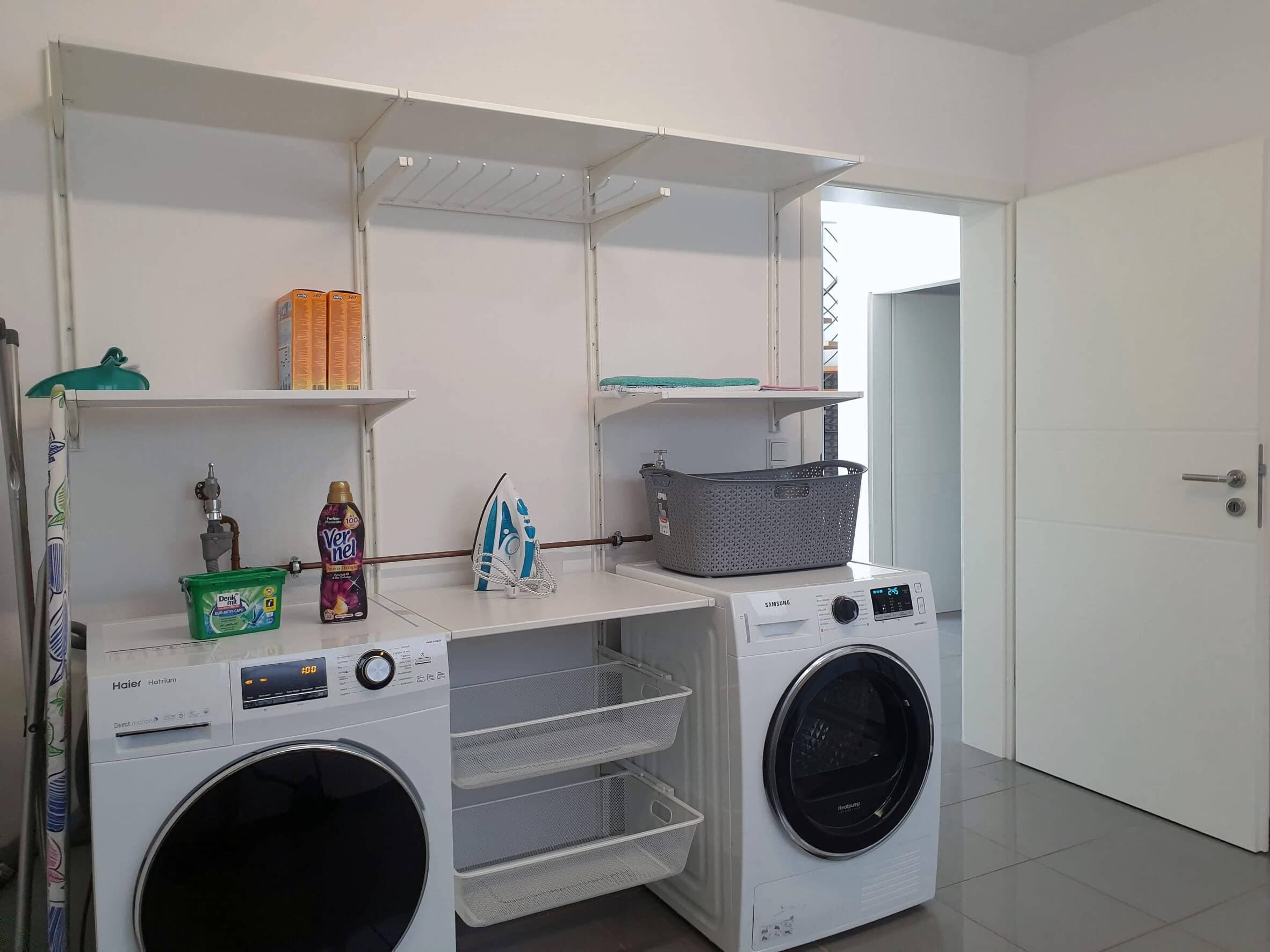 The house on the ground floor is built in an open style, so the kitchen, dining room and living room form a great living area. There is also a bedroom with a place to work with a printer and laptop.